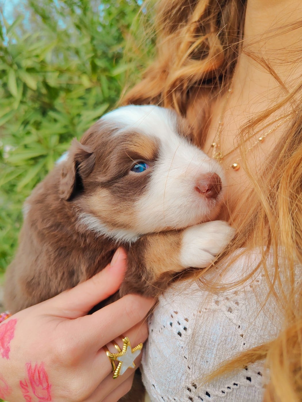 Petite puce rouge merle à queue courte très attachante et câline serait parfaite pour une famille avec enfant